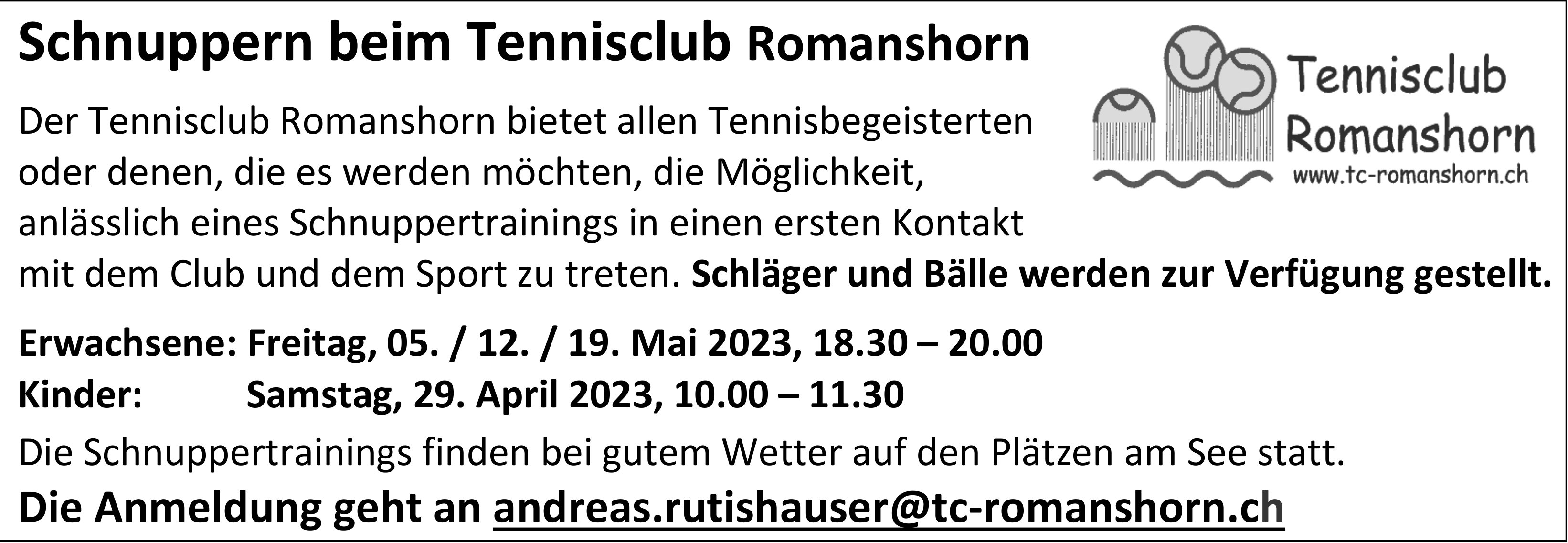 Der Tennisclub Romanshorn bietet allen Tennisbegeisterten oder denen, die es werden möchten, die Möglichkeit, anlässlich eines Schnuppertrainings in einen ersten Kontakt mit dem Club und dem Sport zu treten. Schläger und Bälle werden zur Verfügung gestellt.