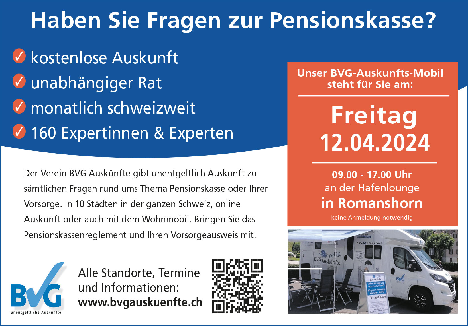 Der Verein BVG Auskünfte gibt unentgeltlich Auskunft zu 09.00 - 17.00 Uhr an der Hafenlounge sämtlichen Fragen rund ums Thema Pensionskasse oder Ihrer